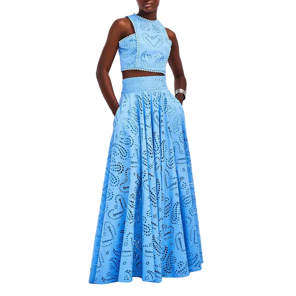Women's Sleeveless High-Neck Crop Top and Eyelet A-Line Maxi Skirt Set
