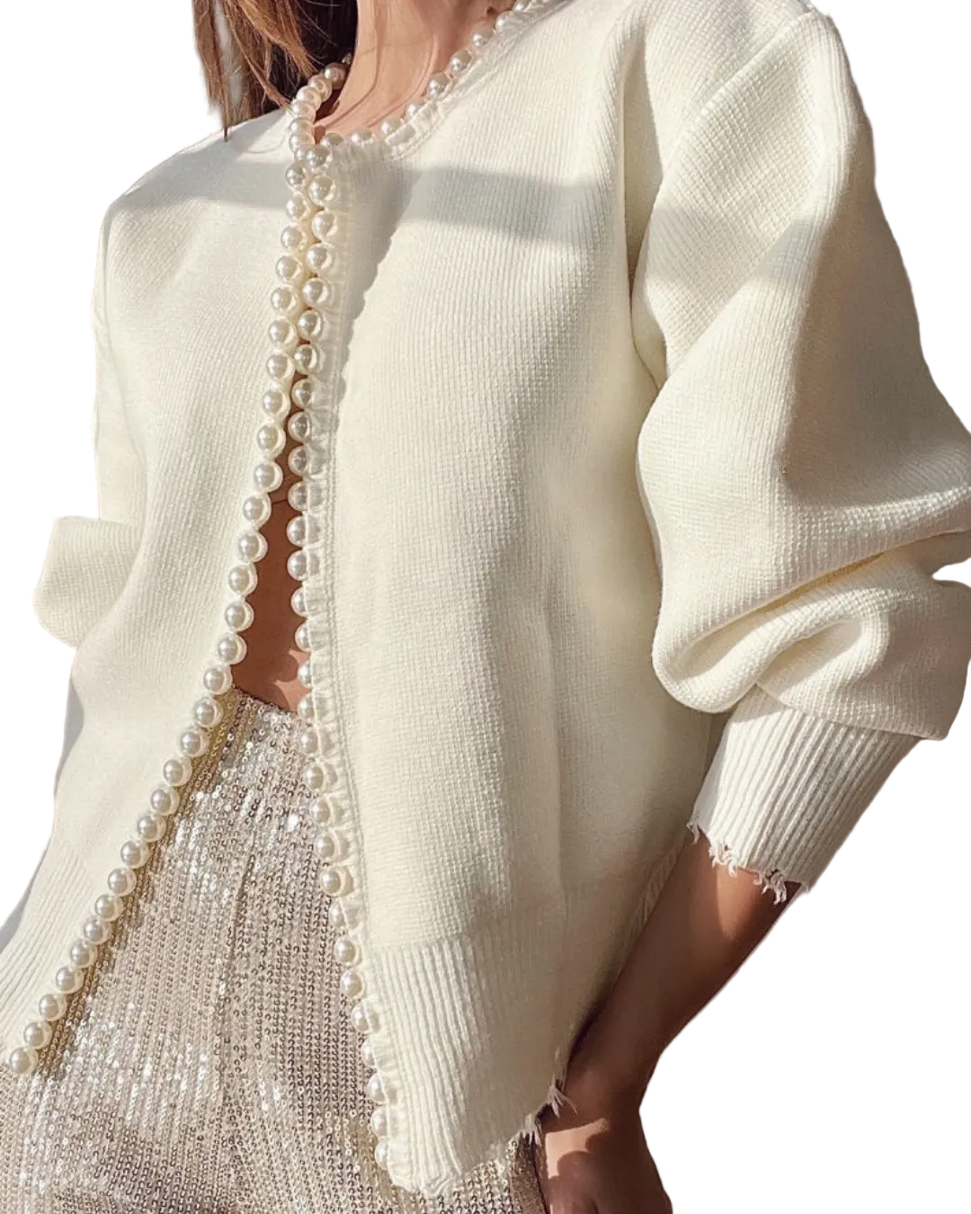 Women's Open-Front Cardigan with Bead Trim and Frayed Hem