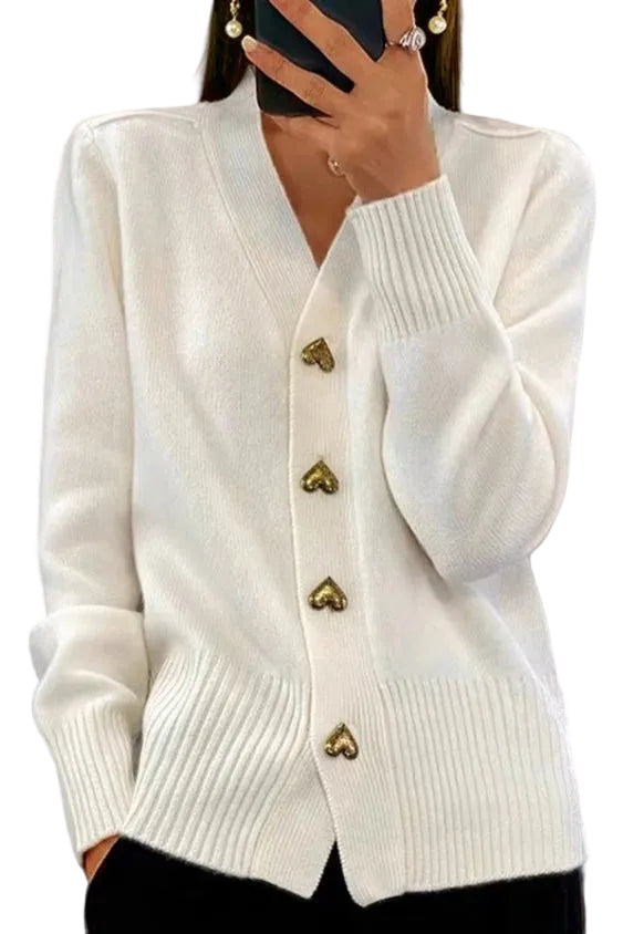 Women's V-Neck Cardigan with Heart-Shaped Buttons and Ribbed Cuffs