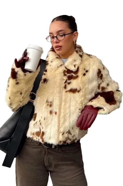 Women's Zip-Front Faux Fur Jacket with Spotted Pattern