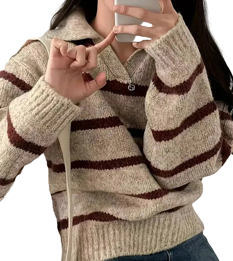 Women's V-Neck Collar Jumper with Horizontal Stripe Pattern and Ribbed Cuffs
