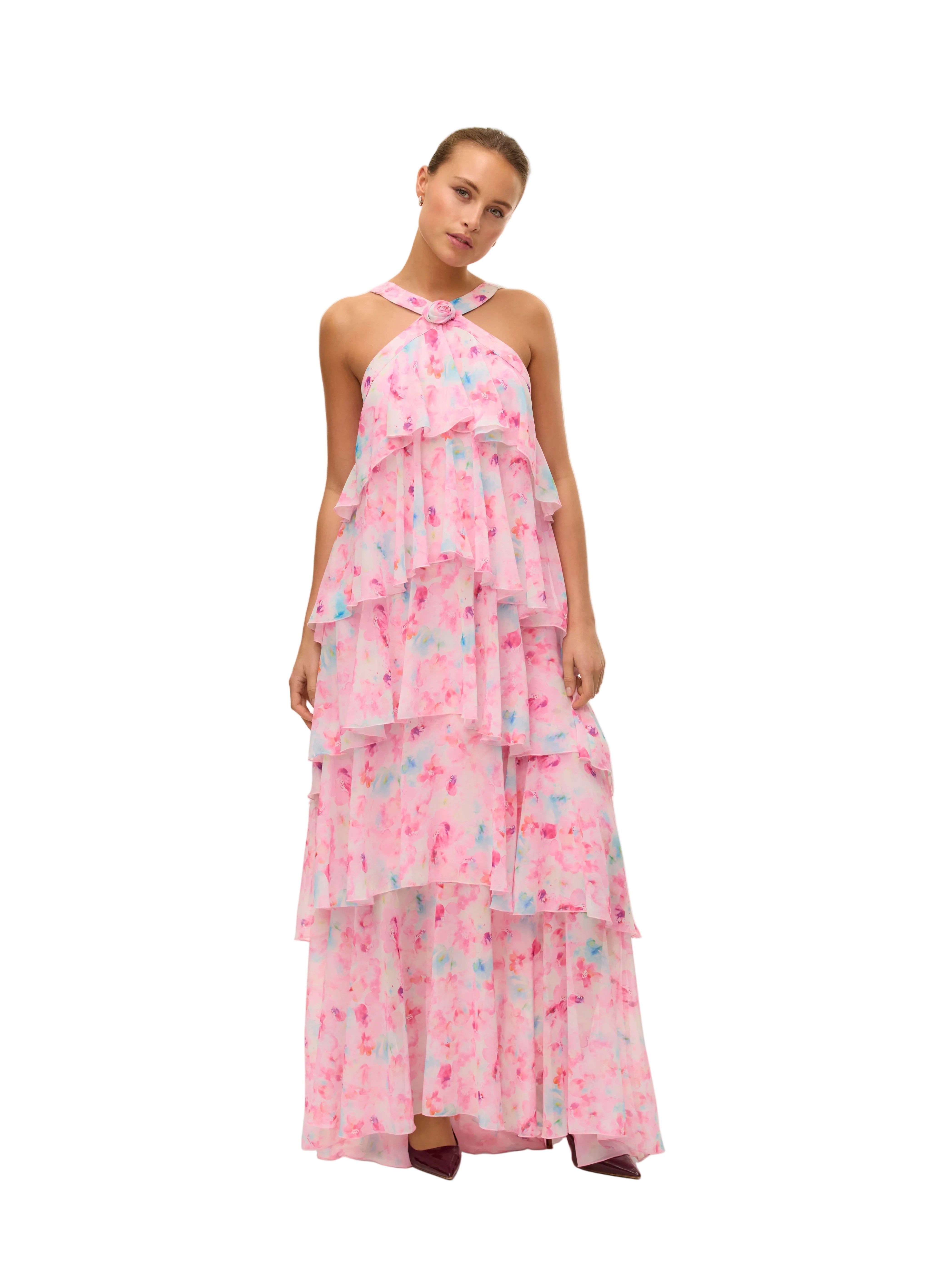Women's Halter Neck Maxi Dress with Cascading Pleated Ruffles