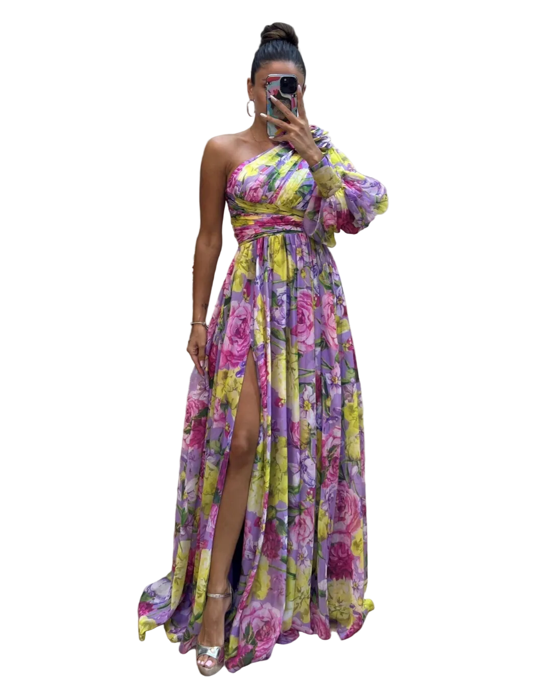 Women's One-Shoulder Floral Maxi Dress with Puff Sleeve and Side Slit