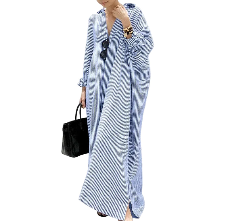 Women's Striped Long Sleeve Maxi Shirt Dress with Spread Collar and Roll-Up Cuffs