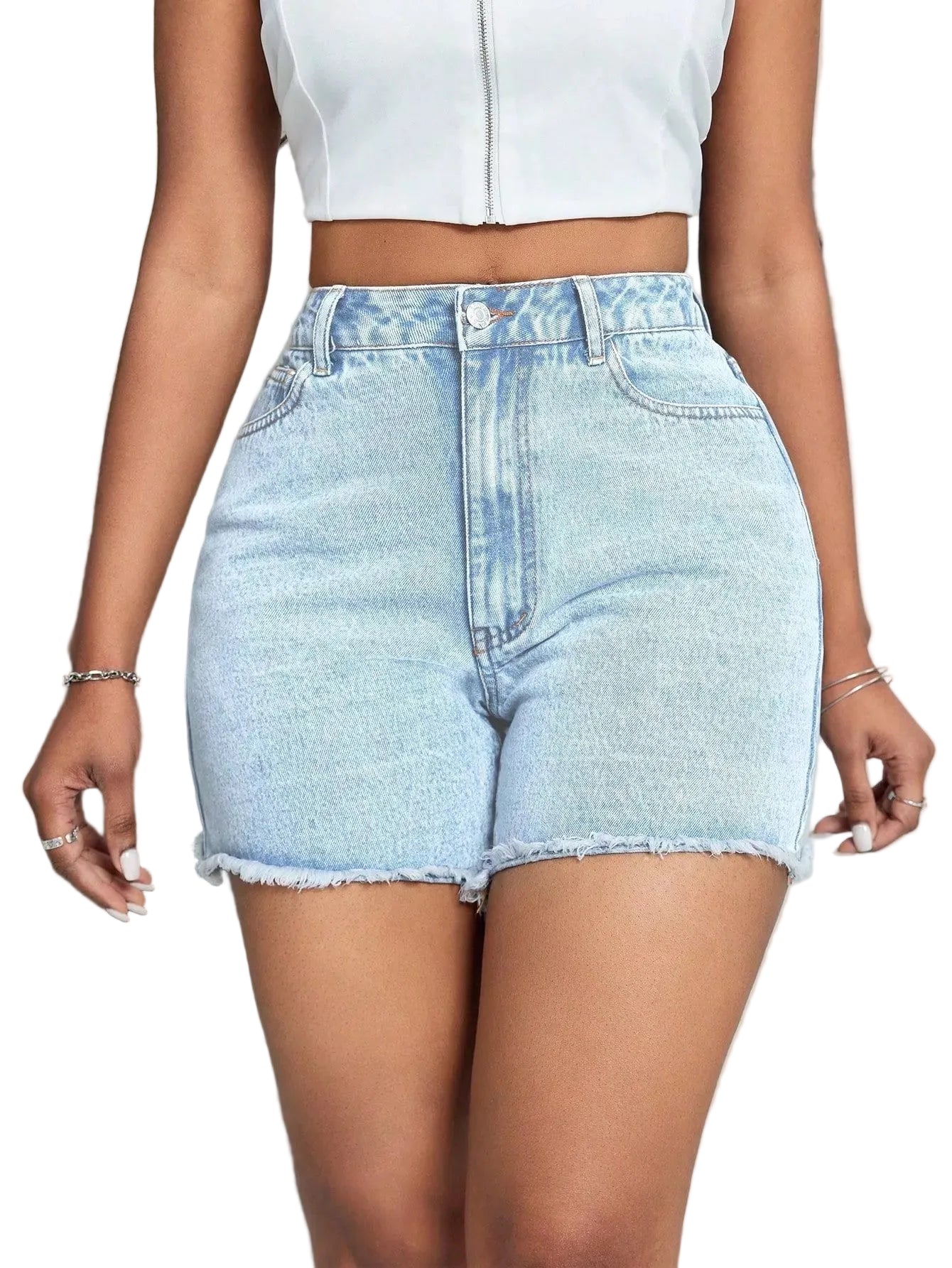 Women's High-Waist Denim Shorts with Raw Hem and Button Closure