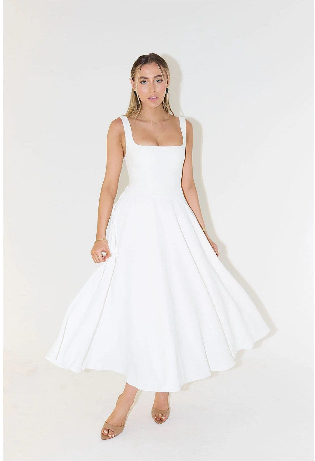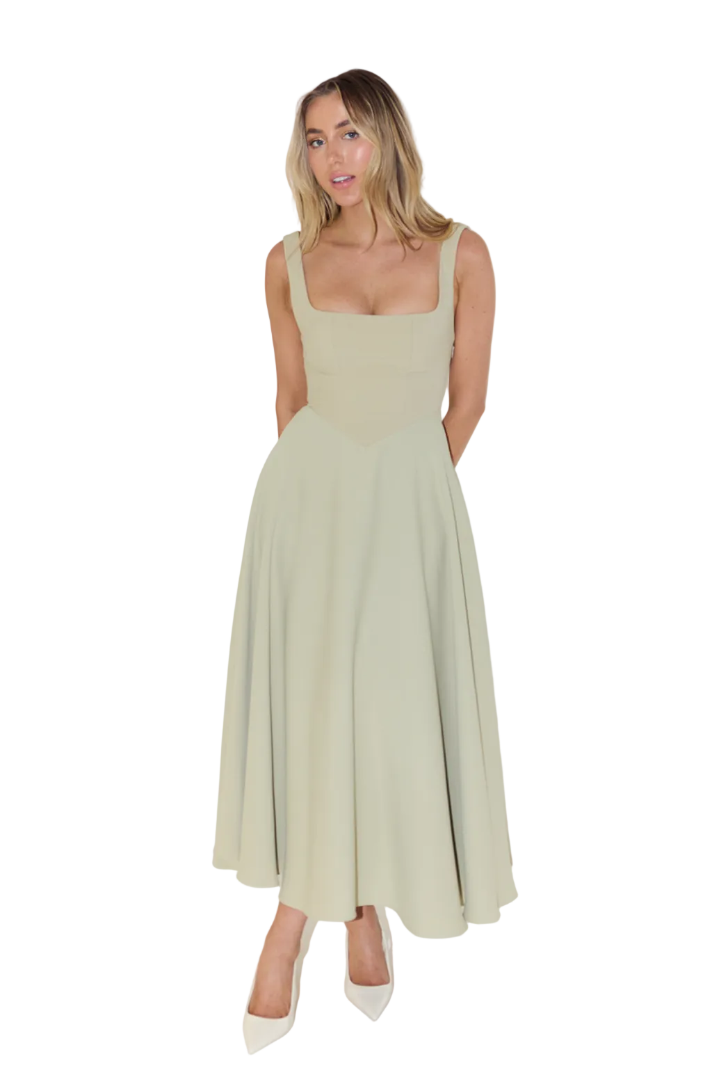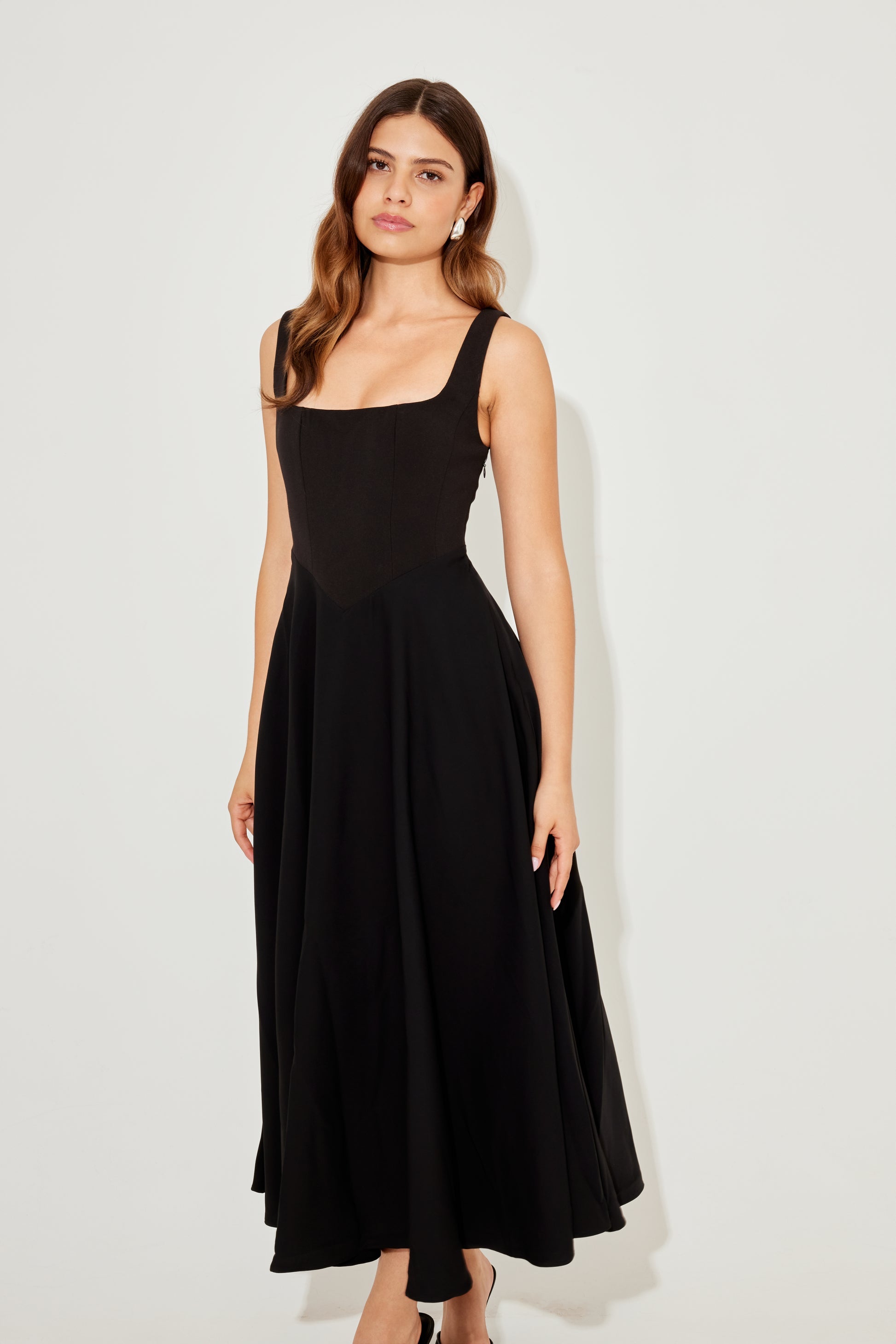 This midi dress for women features a square neckline with wide shoulder straps. The bodice includes vertical princess seam lines extending from bust to waist. The skirt displays a flared A-line shape. The hemline reaches mid-calf length.