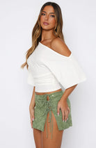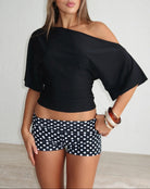 This women's crop top features an asymmetric one-shoulder neckline with one bare shoulder. Short batwing sleeves drape from each side. The body ends at a cropped length at the natural waist.