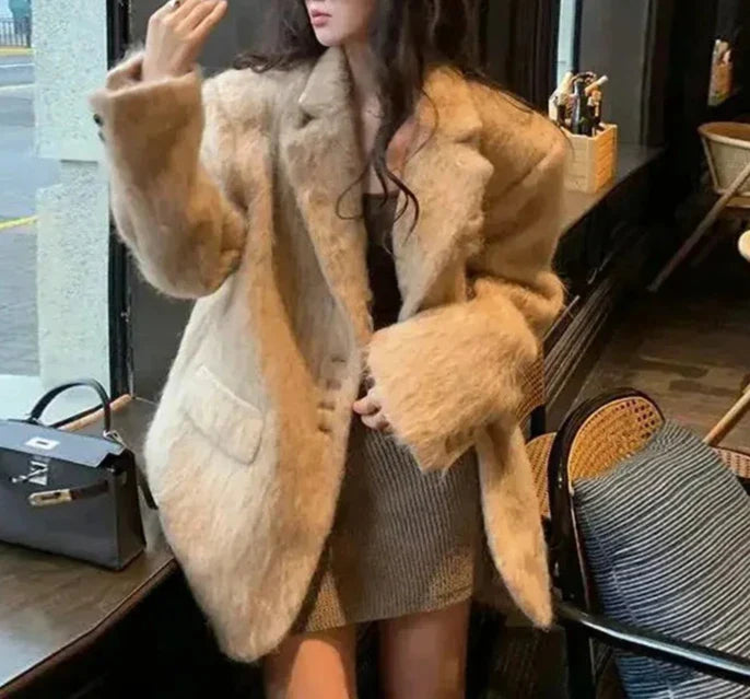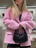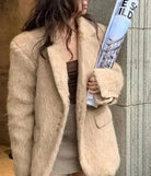 This women's blazer has a single-breasted front with button closure. The blazer includes notched lapels and sits at hip length. Two front flap pockets are positioned on the lower front. Long sleeves and a plush surface complete the outerwear piece.
