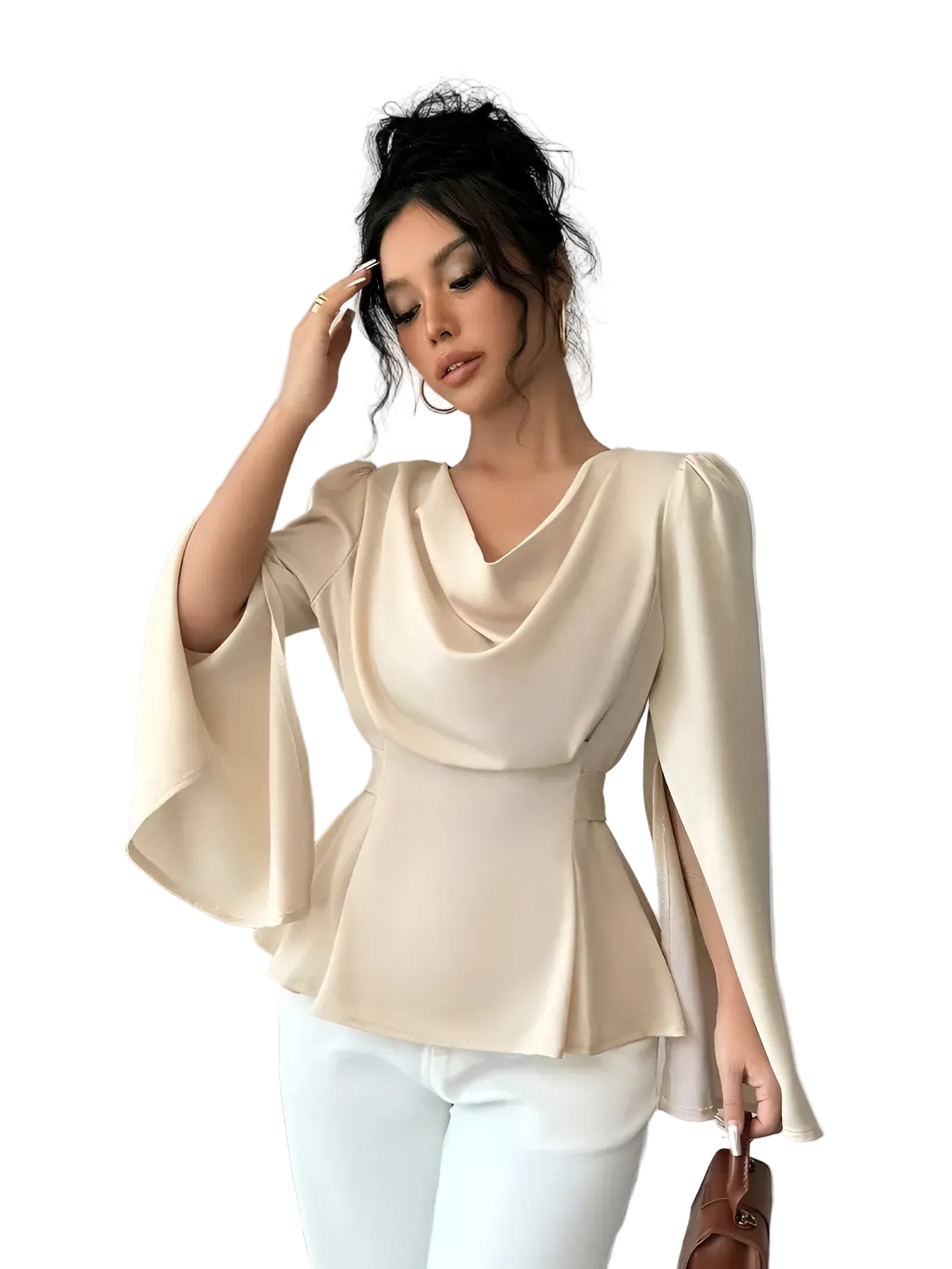 Women's Cowl Neck Blouse with Split Sleeves and Peplum Waist