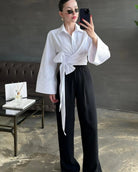 This women's blouse features a spread collar with a partial button placket at the neckline. A wide wrap waistband with a front tie creates the cropped silhouette. Long sleeves extend to wide cuffs at the wrists.