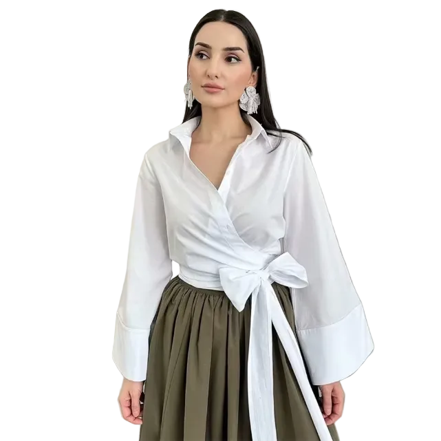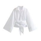Women's Cropped Blouse with Spread Collar and Wrap Waistband