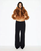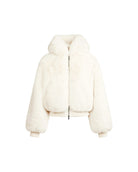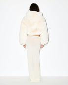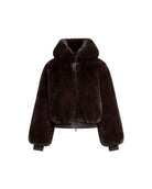 This women's cropped faux fur jacket features an attached hood and a zip-front closure. The long sleeves extend to the wrists with visible cuffs. The jacket has a cropped hemline sitting at waist level. The outer surface displays faux fur throughout the body and sleeves.