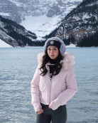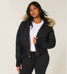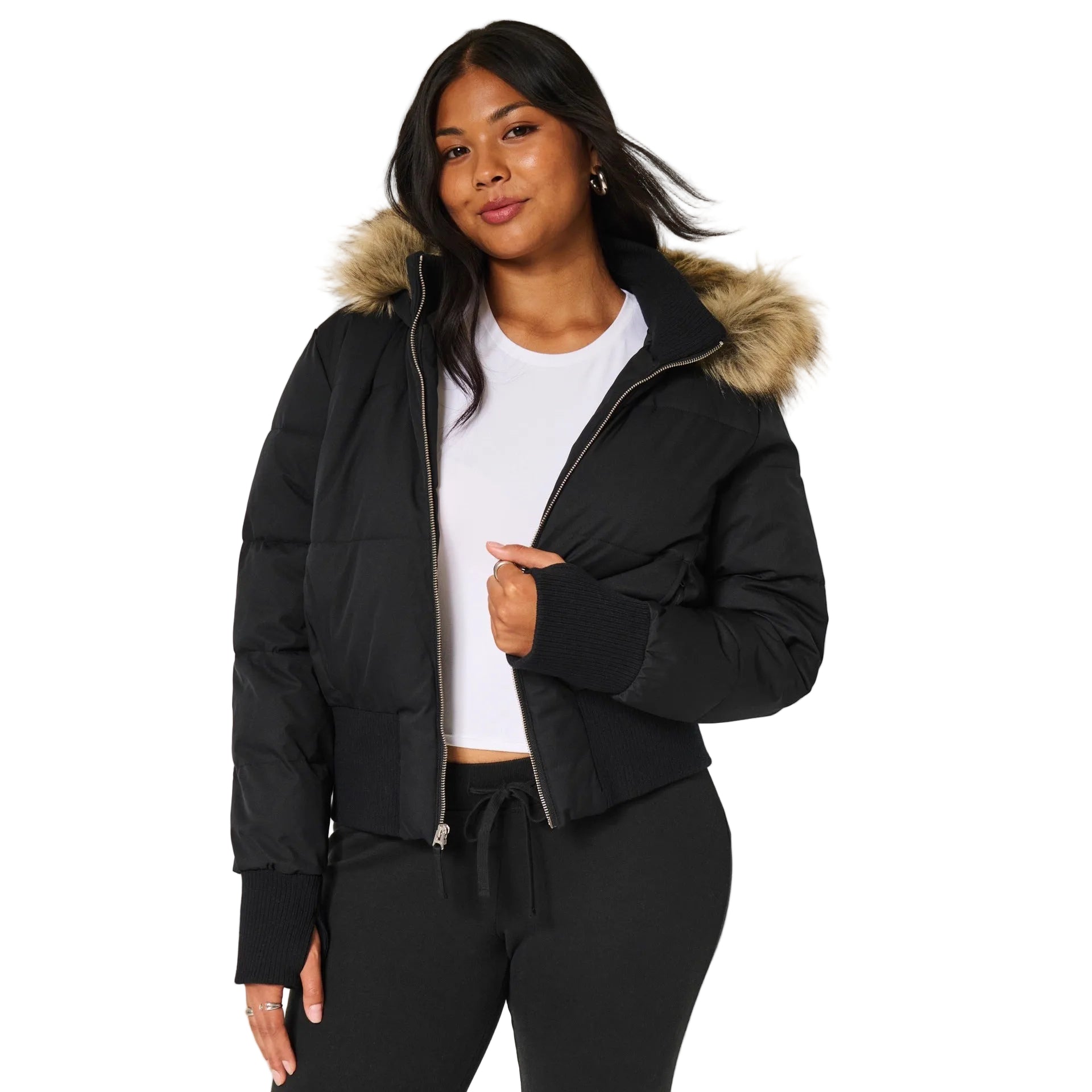 Women's Cropped Puffer Jacket with Faux Fur Hood Trim and Zip Closure