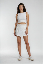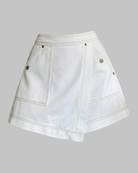 This women's shorts feature a wrap front panel that overlaps at the center. The garment displays visible denim with contrast stitching throughout. Two front patch pockets sit at the hip area with metal buttons. The shorts extend to mini length with a straight hemline.