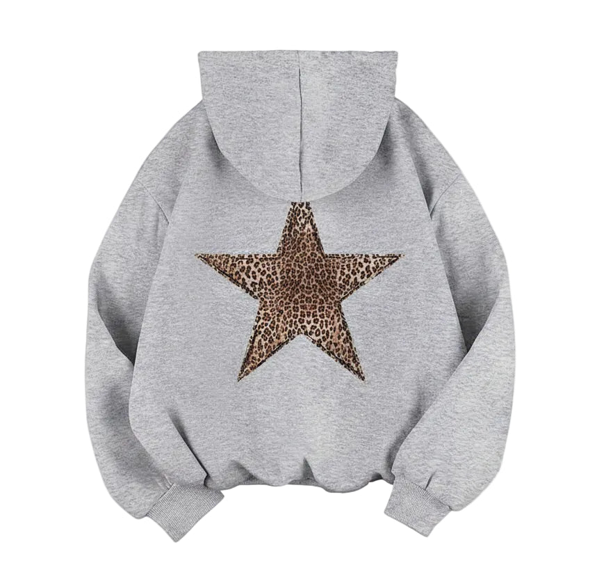 This women's hoodie includes a drawstring hood and long sleeves. A large leopard print star is visible on the back. The front has a kangaroo pocket. Ribbed cuffs and a ribbed hem are present at the wrists and lower edge.