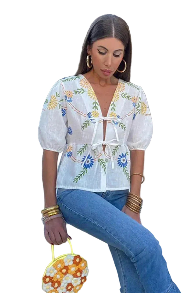 Women's Embroidered V-Neck Blouse with Tie-Front Closure and Puff Sleeves