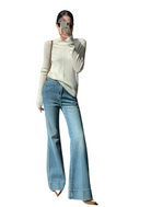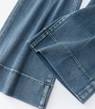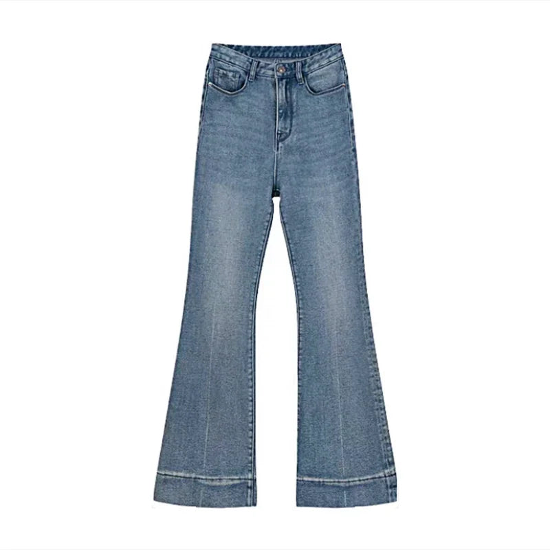 These women's pants have a wide-leg shape with a flared leg opening. The pants feature full-length legs extending to the ankles. The front includes a button and zipper fly closure with visible front pockets. The hem displays contrast stitching.
