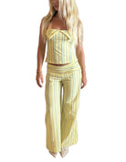 This women's two-piece summer set includes a halter neck top and matching wide-leg pants. The top displays a straight neckline with a centre twist at the front and halter tie straps at the back of the neck. Both pieces display a vertical stripe pattern throughout. The pants extend to full length with a wide leg.