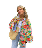 Women's Quilted Floral Jacket with Round Neckline and Striped Trim
