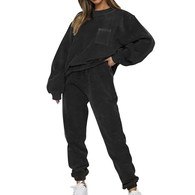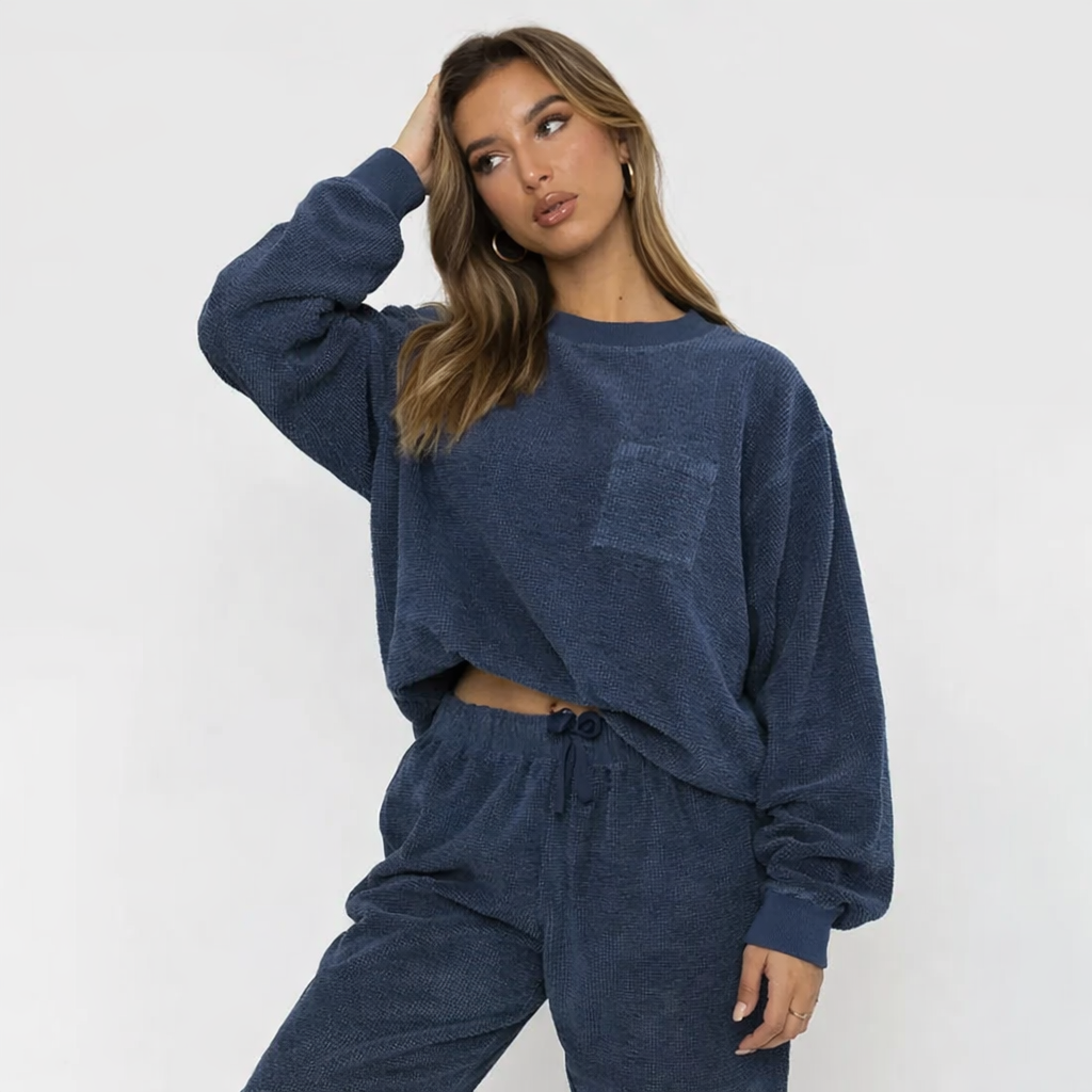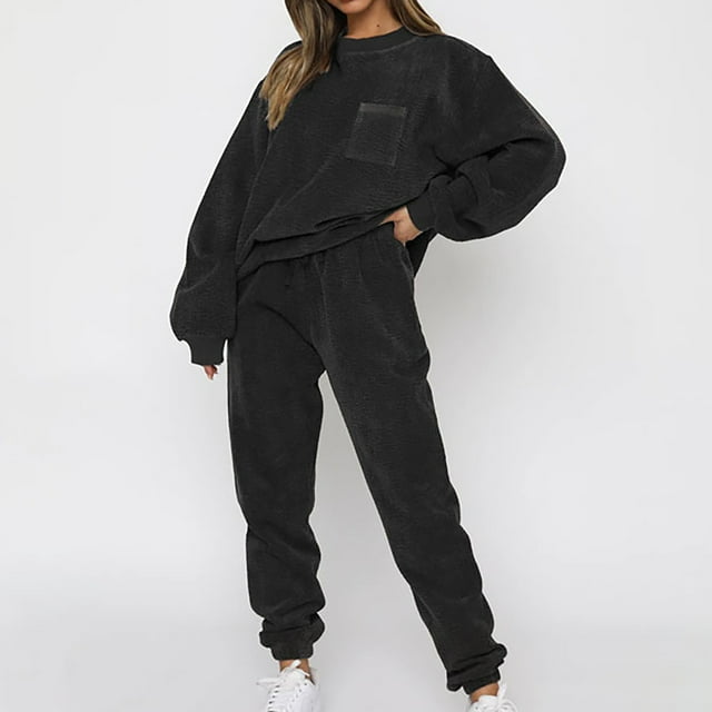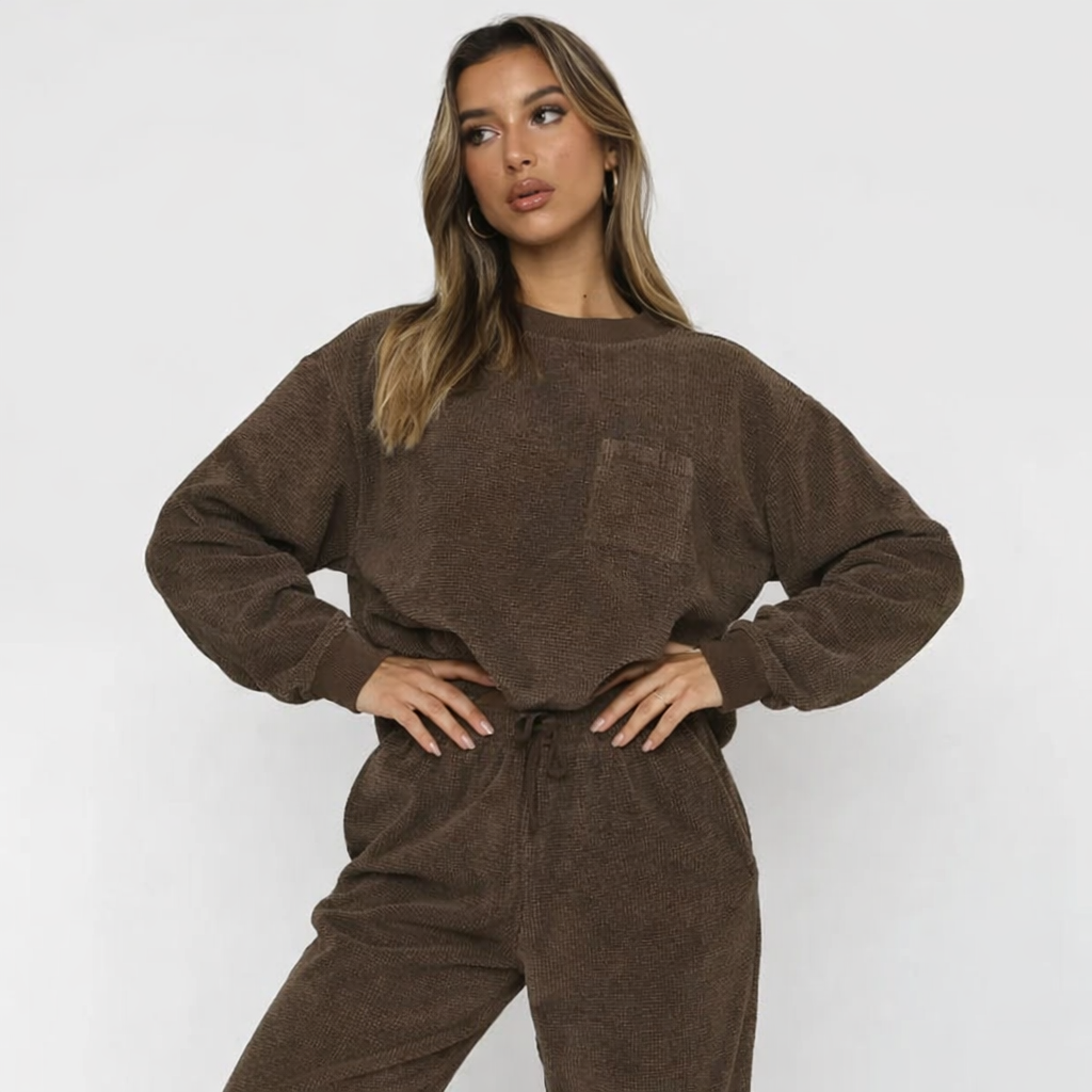This set for women includes a crew neckline top and joggers with an elastic waistband. The top features long sleeves with ribbed cuffs and a ribbed surface. The joggers have a drawstring closure at the waist, side pockets, and ribbed ankle cuffs. Both pieces show a ribbed vertical surface pattern.
