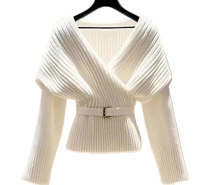 Women's Ribbed Wrap Jumper with Deep V-Neckline and Belted Waist