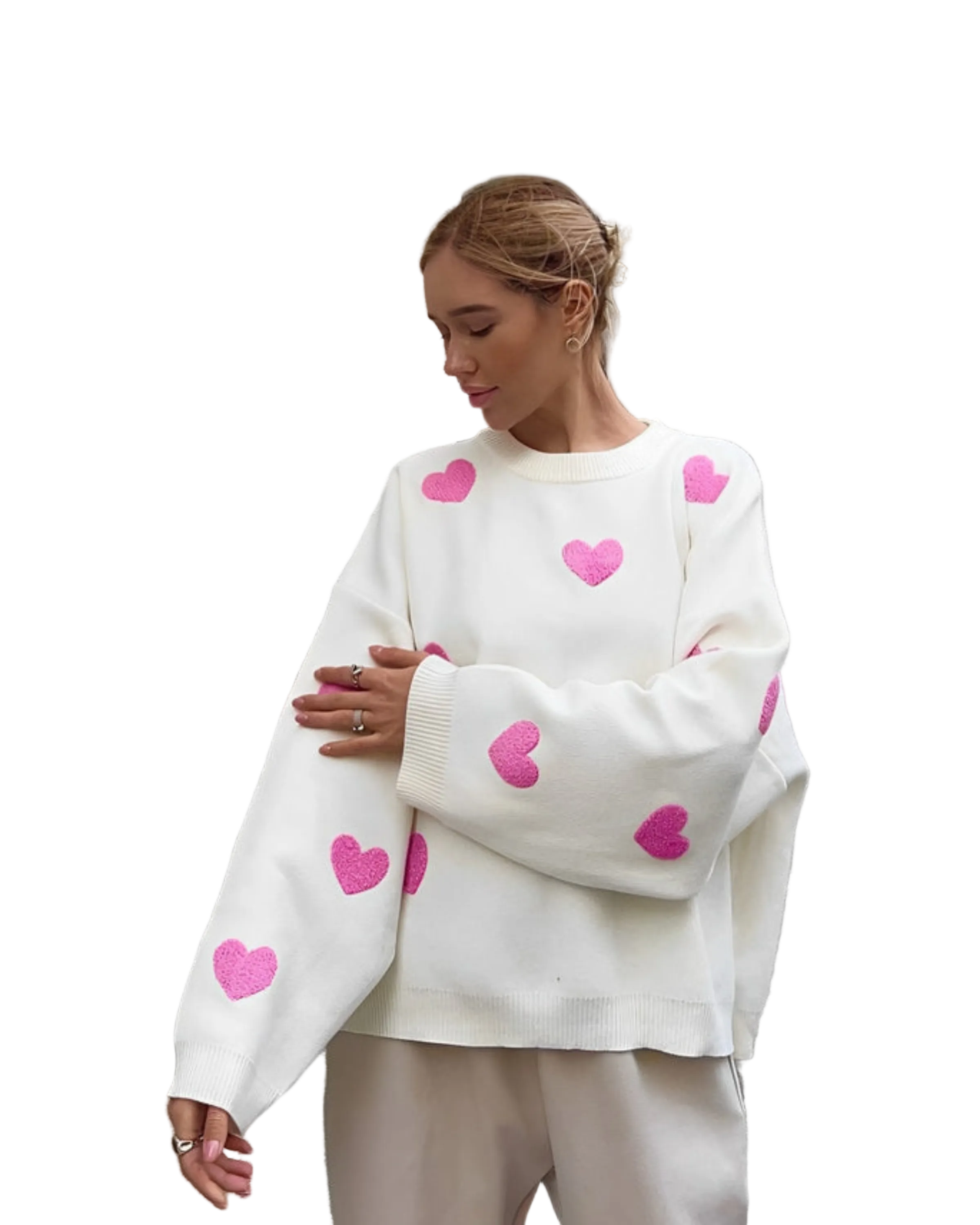 This women's jumper has a ribbed round neckline and long sleeves with a dropped shoulder line. Multiple heart-shaped appliqués are positioned on the front and sleeves. The sleeves end with ribbed cuffs. The ribbed hem sits at hip length.