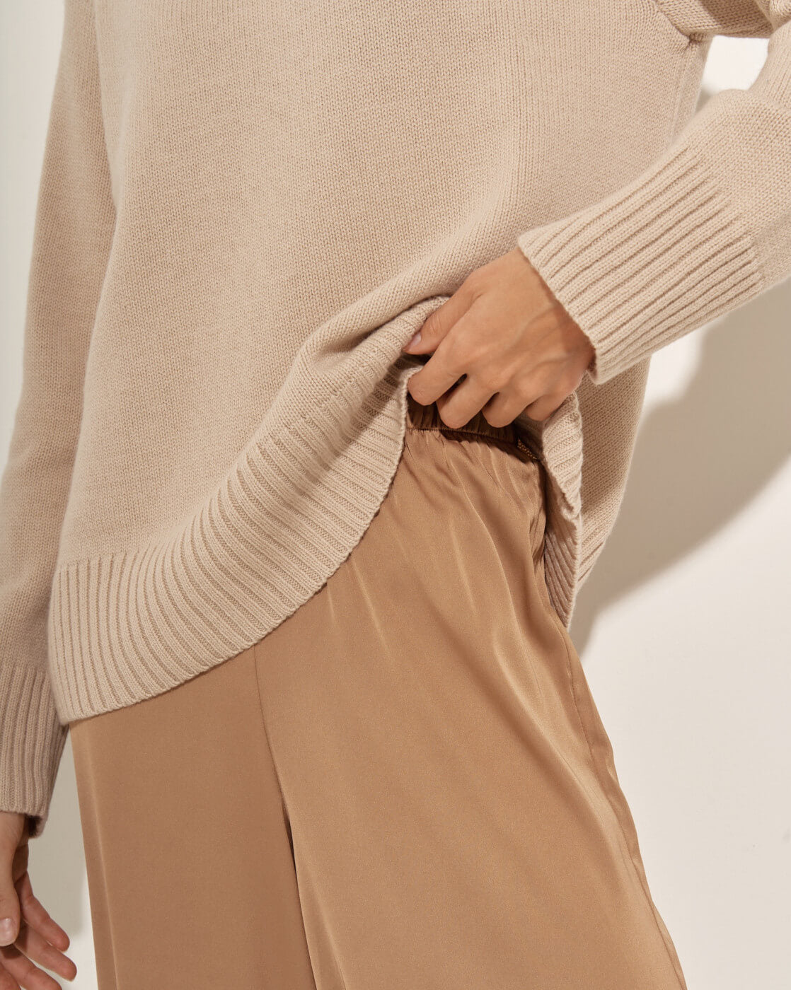 This women's jumper has a high round neckline with a ribbed finish. The long raglan sleeves feature visible diagonal seam lines from the neckline to the underarm. The sleeves end with ribbed cuffs at the wrists. The entire garment displays a visible knit surface. The bottom hem has a ribbed finish.