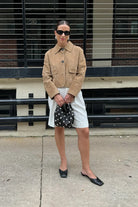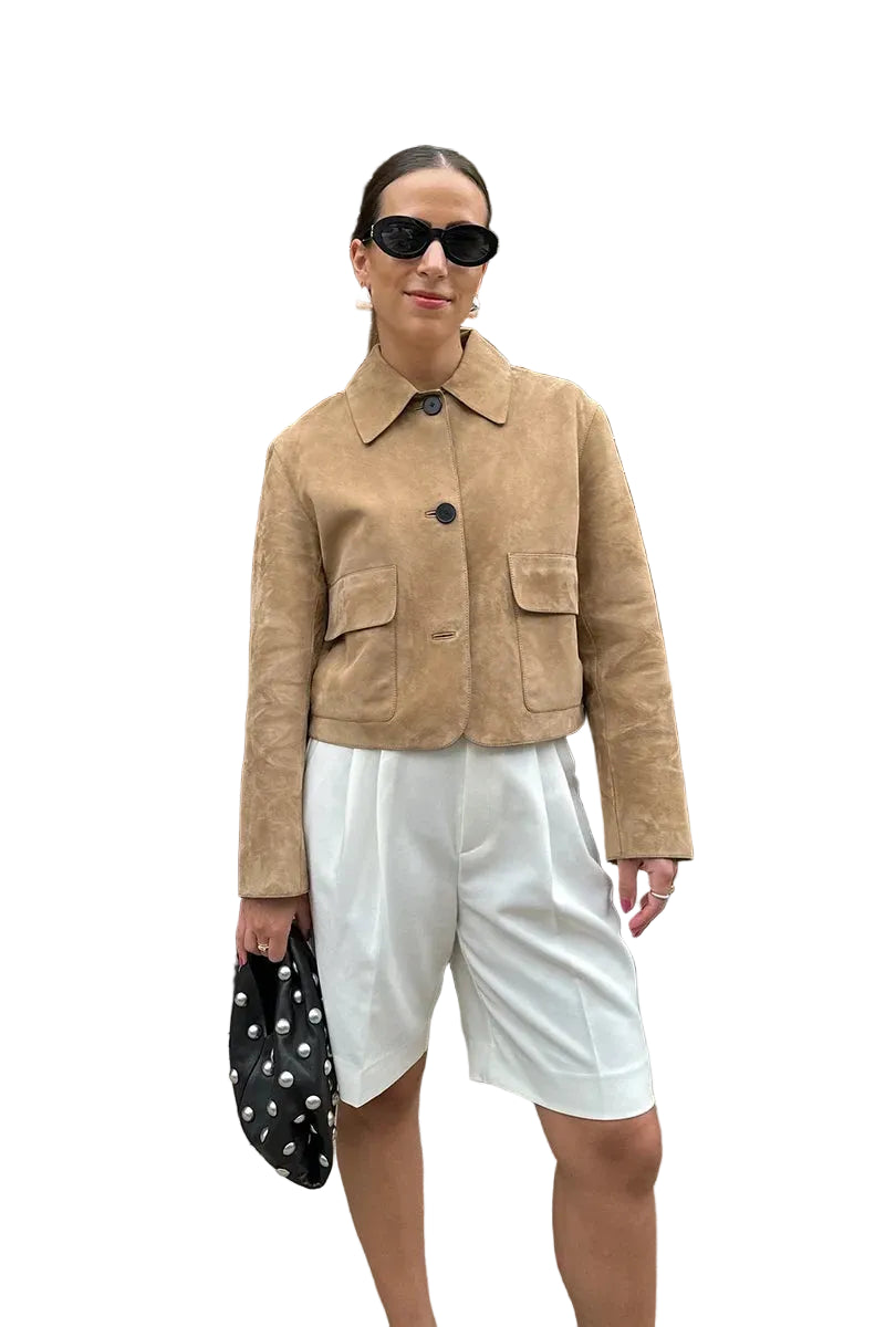 This women's jacket features a cropped length ending at the waist. The front includes a button closure with a rounded collar. Two patch pockets with flap closures are positioned at the front of the jacket. Long sleeves and a matte surface complete the outerwear piece.