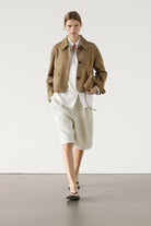 Women's Short Button-Front Jacket with Rounded Collar and Flap Patch Pockets
