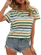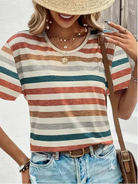 This women's top has a round neckline and short sleeves. Horizontal stripes in multiple colours run across the front and back. The hemline is straight at the bottom. The sleeves end above the elbow.