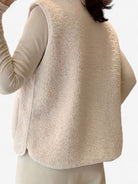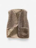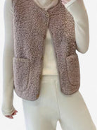This women's sleeveless jacket features open armholes. A V-neckline frames the open front. The outer surface displays a visible curly pattern throughout. A lining is shown on the interior where the front panel folds back. Two patch pockets sit at the front.