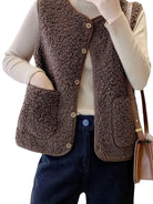 Women's Sleeveless Jacket with Curly Pattern V-Neckline and Front Pockets