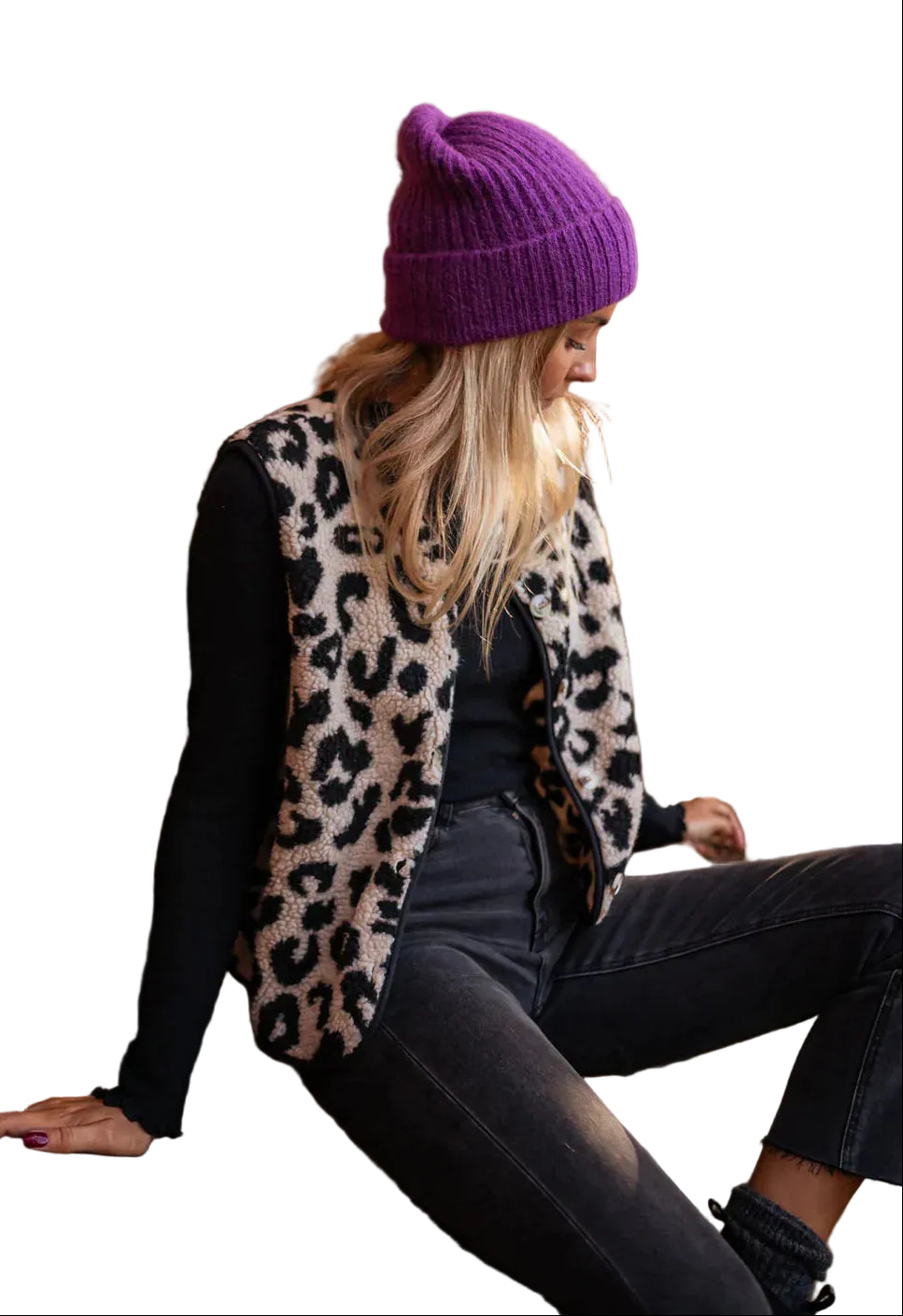 Women's Sleeveless Leopard Print Jacket with Button-Front Closure and V-Neckline