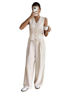 Women's Sleeveless V-Neck Button-Front Vest and Wide-Leg Trousers Set