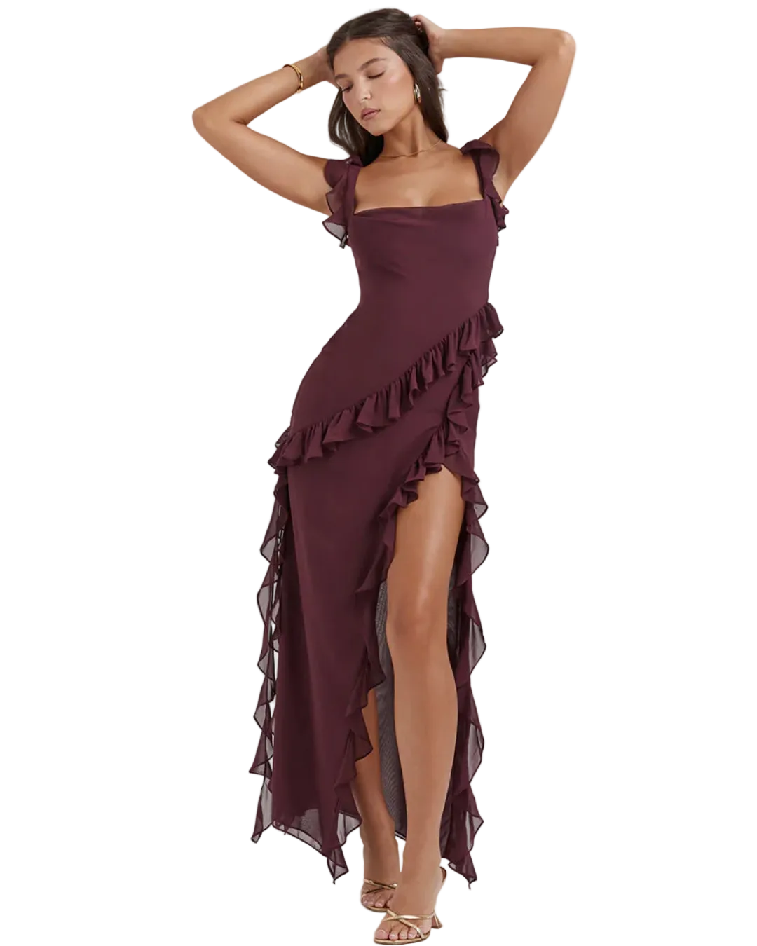 This women's maxi dress features a square neckline and ruffle cap sleeves at the shoulders. Diagonal ruffle trim extends across the front bodice and continues along the skirt edge. A high front slit with ruffle edging is positioned on one side. The hemline presents an asymmetric shape with ruffle trim throughout.