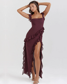 Women's Square Neckline Maxi Dress with Ruffle Trim and High Front Slit