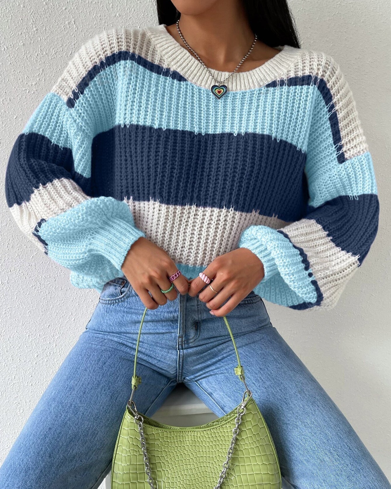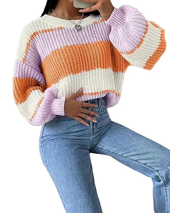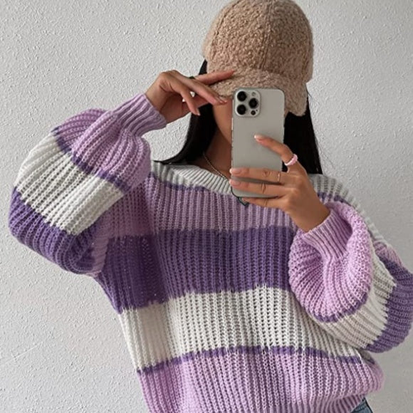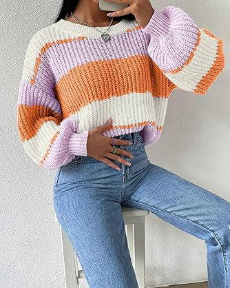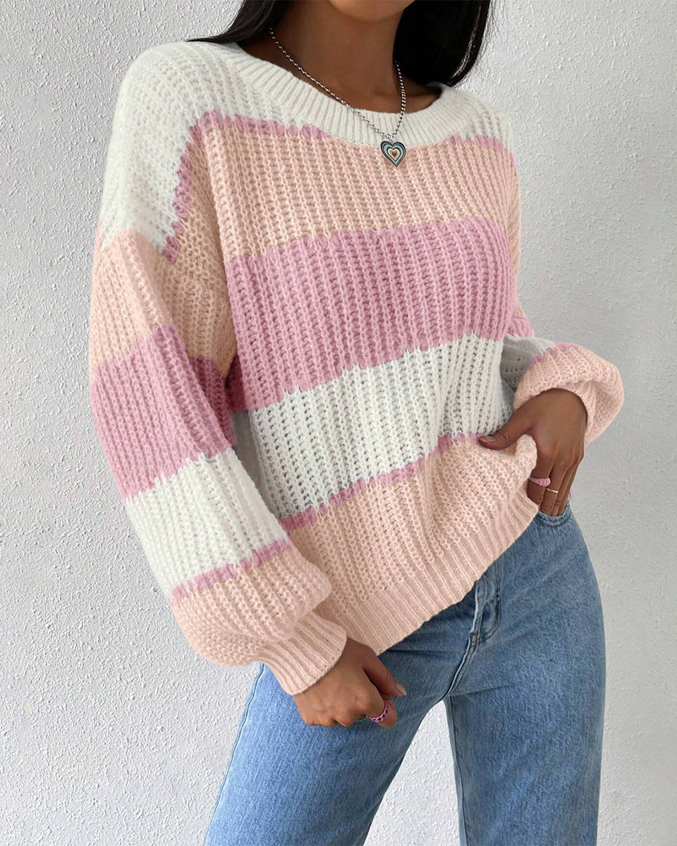 Women's Striped Knit Jumper with Crew Neckline and Long Sleeves