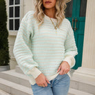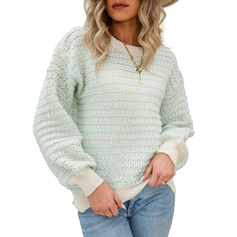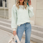 This women's jumper displays horizontal stripes in two contrasting colours throughout. A crew neckline with contrast ribbed trim sits at the collar. Long sleeves extend to ribbed cuffs at the wrist. The hemline has a scalloped edge finish.