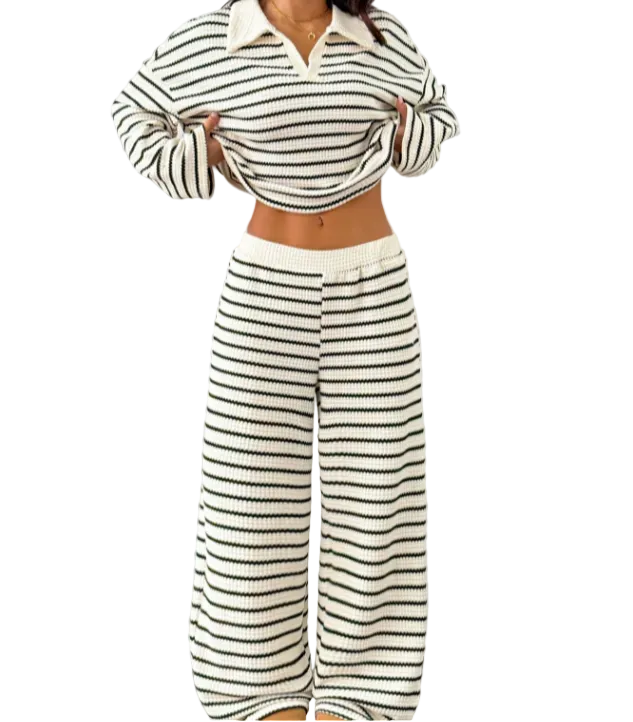 Women's Striped Two-Piece Knit Set with Collar Top and Wide-Leg Pants