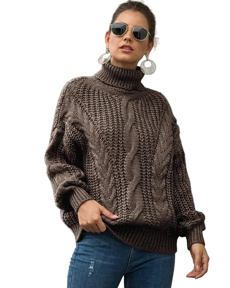 This women's jumper features a high fold-over turtleneck. The front displays a cable knit pattern with twisted stitches. Long sleeves end with ribbed cuffs at the wrists. The bottom edge has a wide ribbed band finishing.