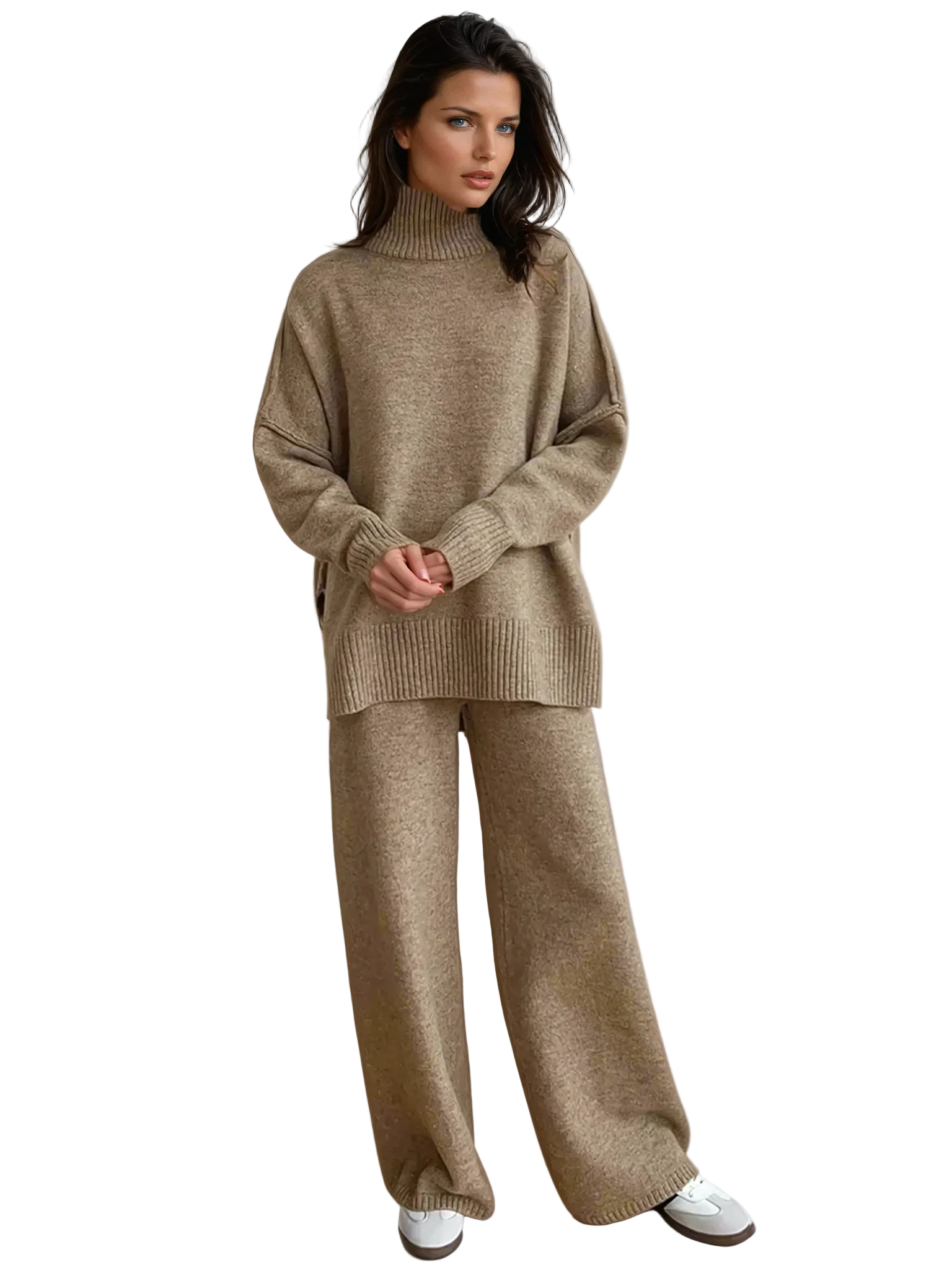 Women's Turtleneck Knit Set with Wide-Leg Pants and Ribbed Cuffs