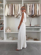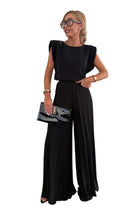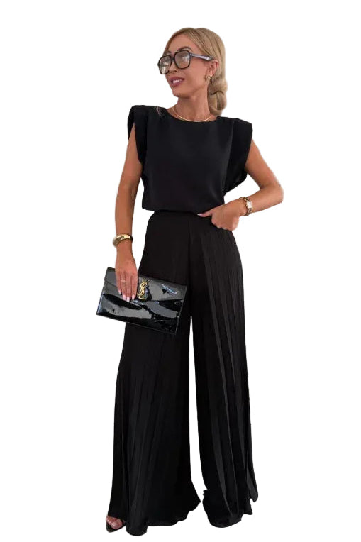 This women's two-piece set includes a sleeveless top and matching full-length wide-leg pants. The top features a round neckline and padded shoulders. The pants display vertical pleating throughout with a wide-leg opening at the hem. Both pieces are sold together as a coordinating set.