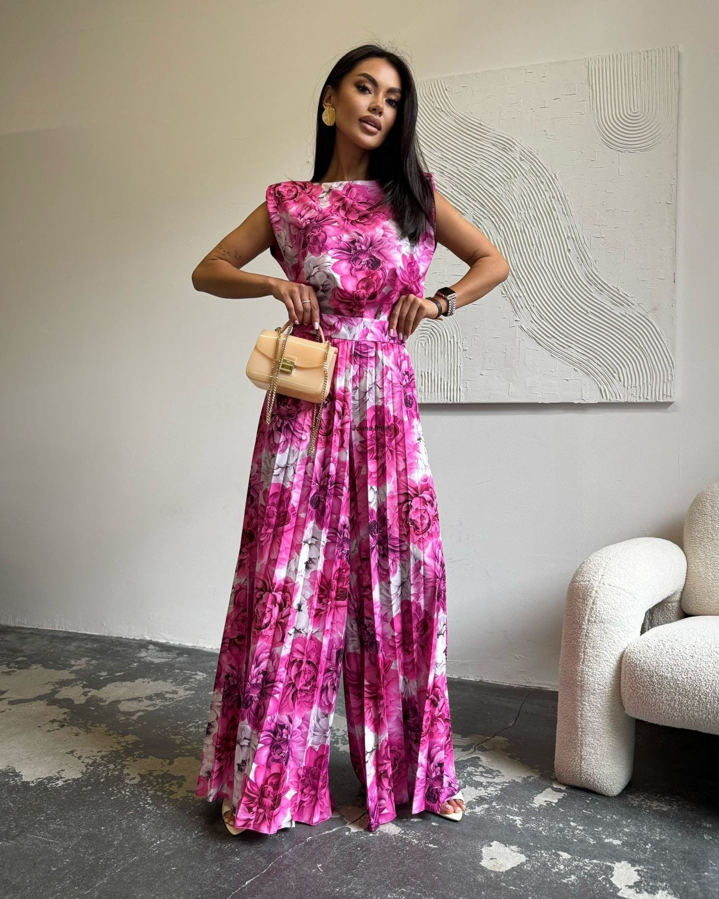 Women's Two-Piece Padded Shoulder Set with Pleated Wide-Leg Pants