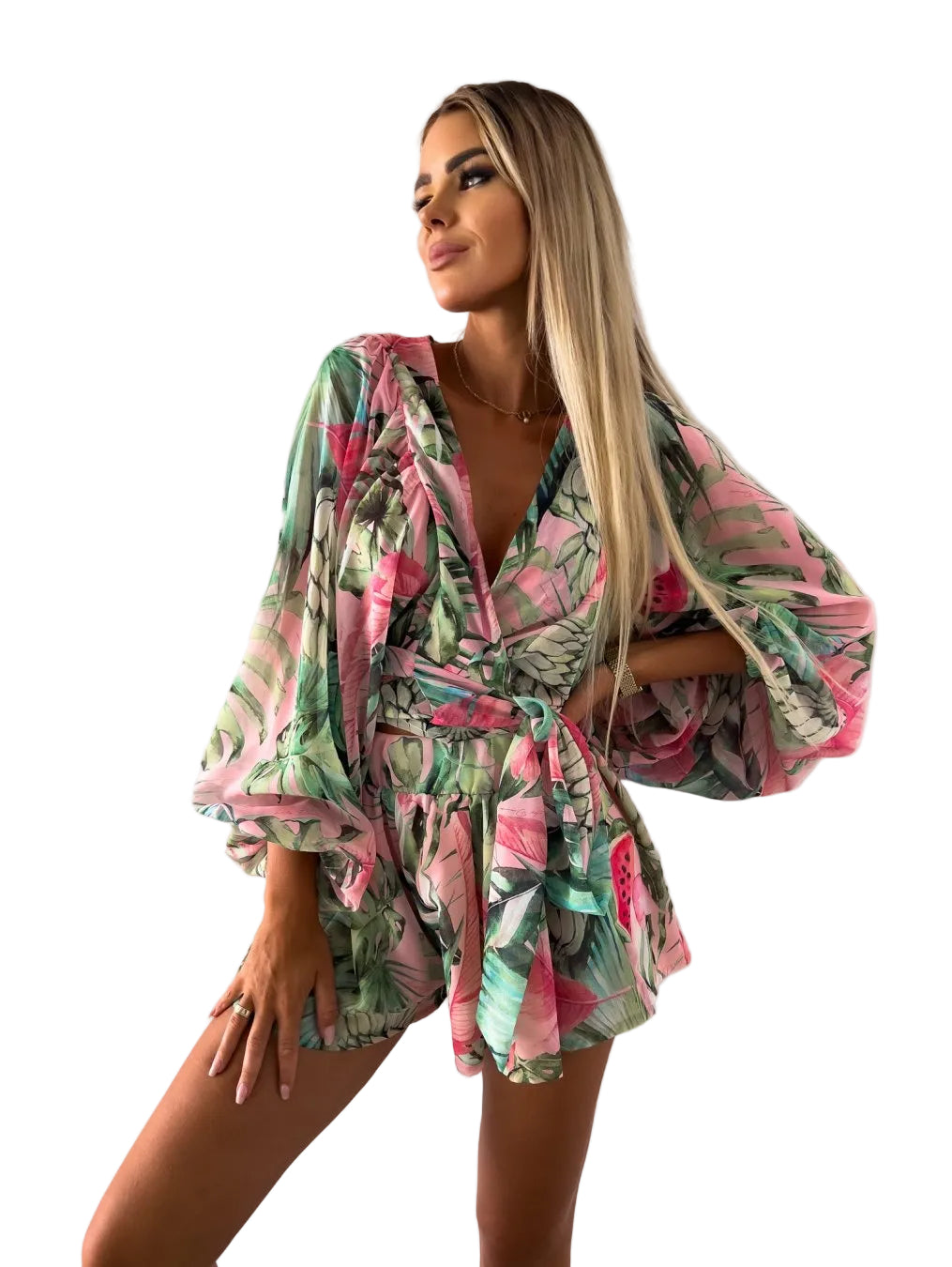 This women's short jumpsuit has a V-neckline with a wrap front at the bodice. The long sleeves are balloon-shaped and gather at the wrists. A self-tie belt sits at the waist. The shorts portion ends at mid-thigh with a ruffle hem.