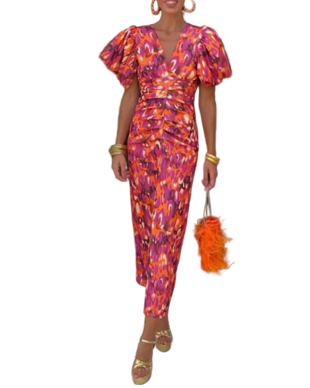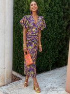 This women's midi dress features a deep V-shaped neckline and short puff sleeves with gathered volume. A ruched section is positioned at the waist area, and the dress narrows from the waist toward the hemline. The hemline ends at midi length below the knee. The surface displays an abstract multicolour print pattern throughout.