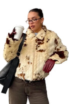 This women's faux fur jacket displays a spotted pattern with brown patches across a cream base. The front opens with a zip closure from hem to neckline. Long sleeves extend to the wrists, and the jacket sits at cropped hip length. A faux fur surface covers the entire body and sleeves.