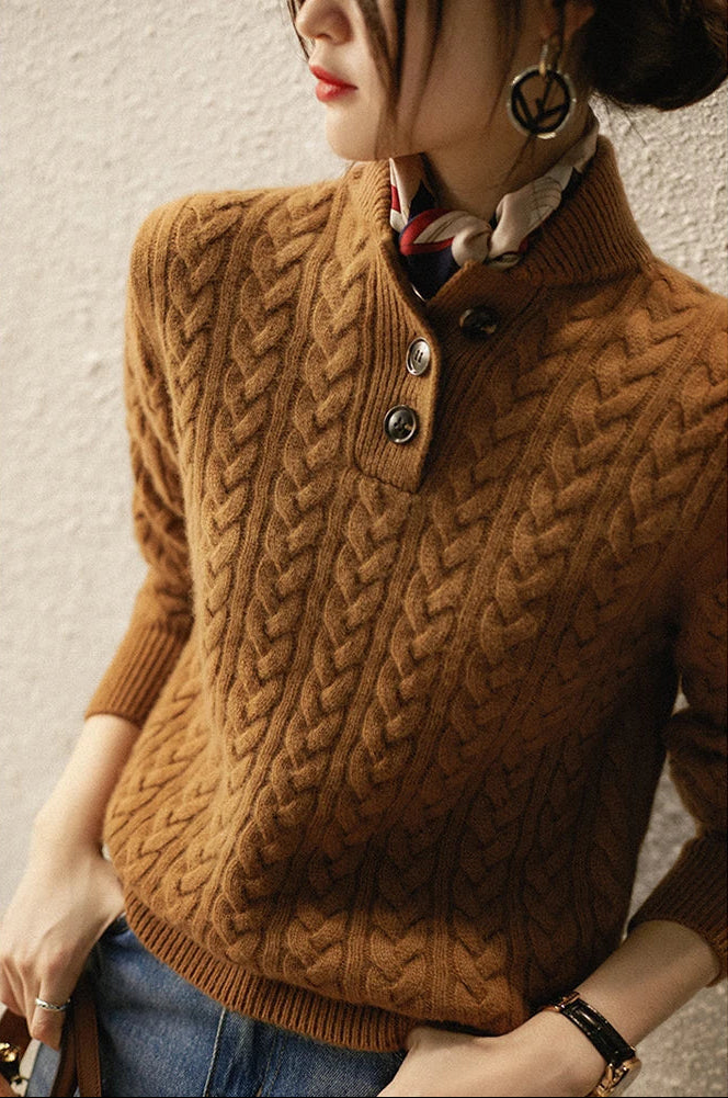 Women's Cable Knit High Collar Jumper with Button Closure and Long Sleeves