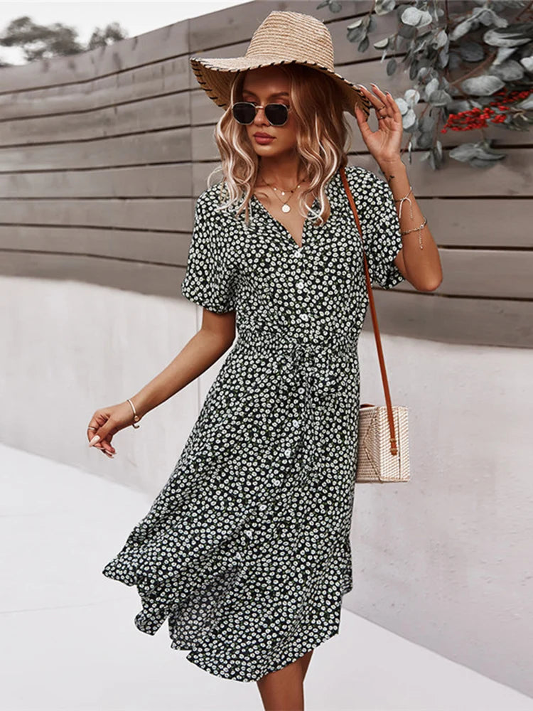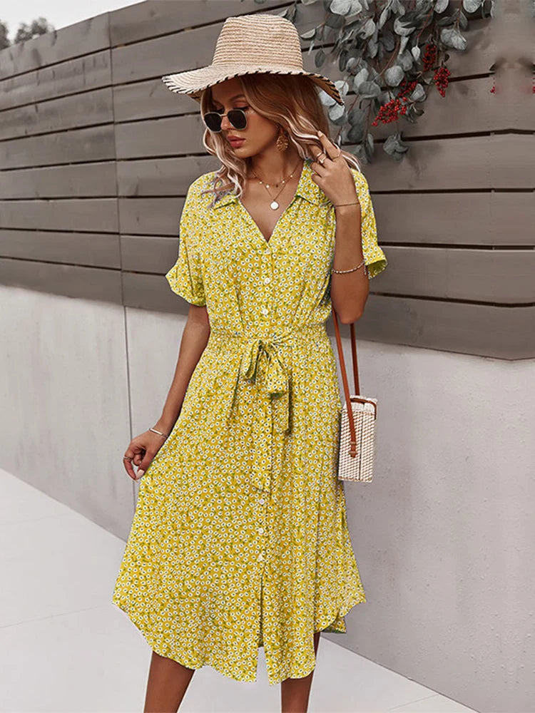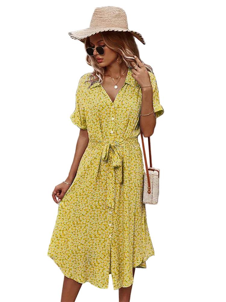 This women's shirt dress has a V-neckline with a pointed collar and button-front closure running from the neckline to the hem. The short sleeves have a flutter hem at the edges. The waist tie is attached at the sides and ties at the front. An all-over small floral print covers the entire garment and the hemline ends at midi length.