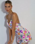 This women's mini dress features a cowl neckline with a draped section at the front. Thin gold-toned chain-link straps are positioned at the shoulders. The hemline ends at mini length above the knee. The surface displays a multicolour floral print pattern with sequins throughout.