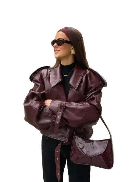 Women's Cropped Glossy Jacket with Wide Lapel Collar and Waist Belt
